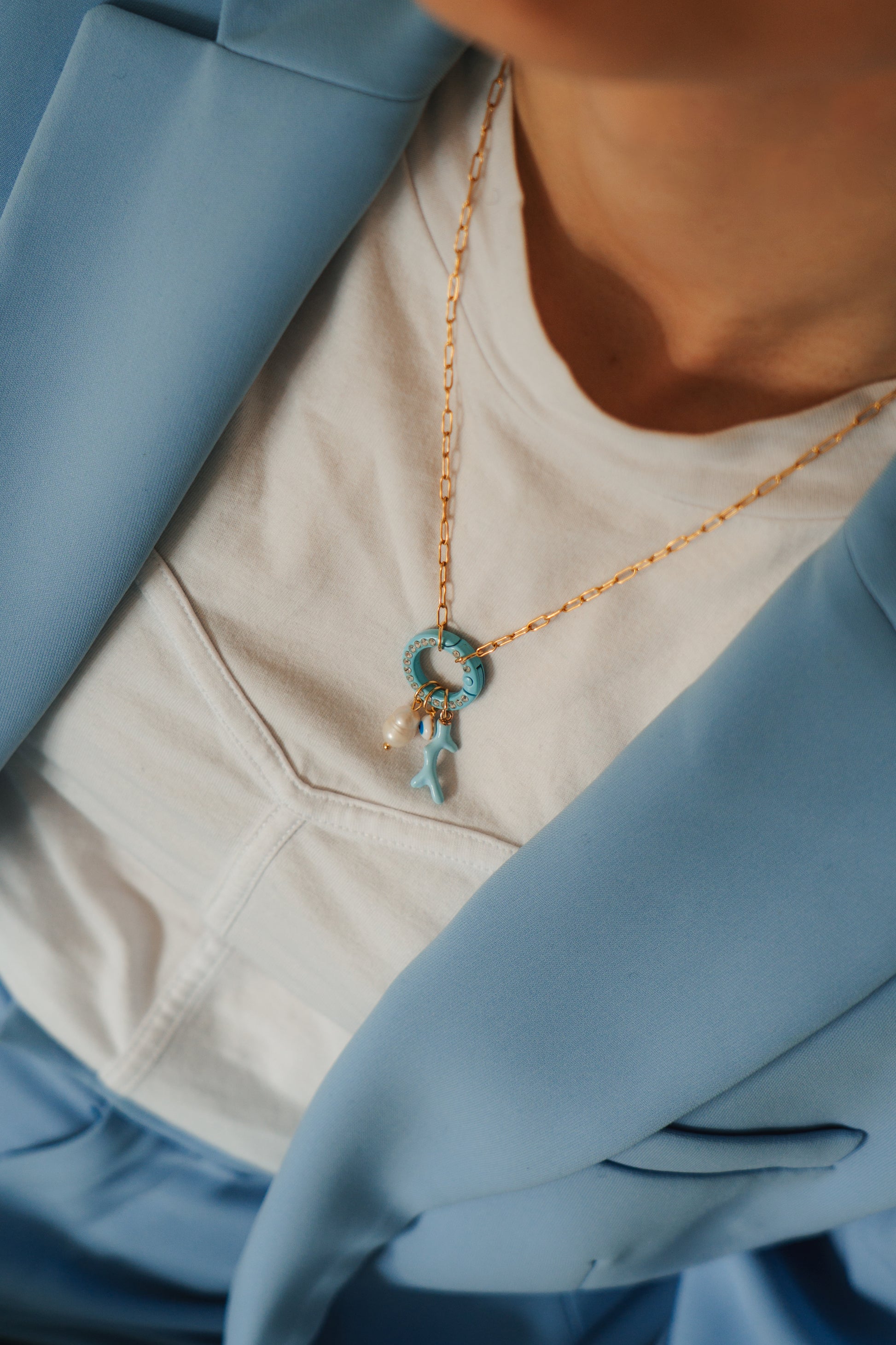 Un collier lumineux et irrésistible, inspiré par l'élégance authentique et sauvage de Mykonos, où les nuances de bleu évoquent la mer cristalline.