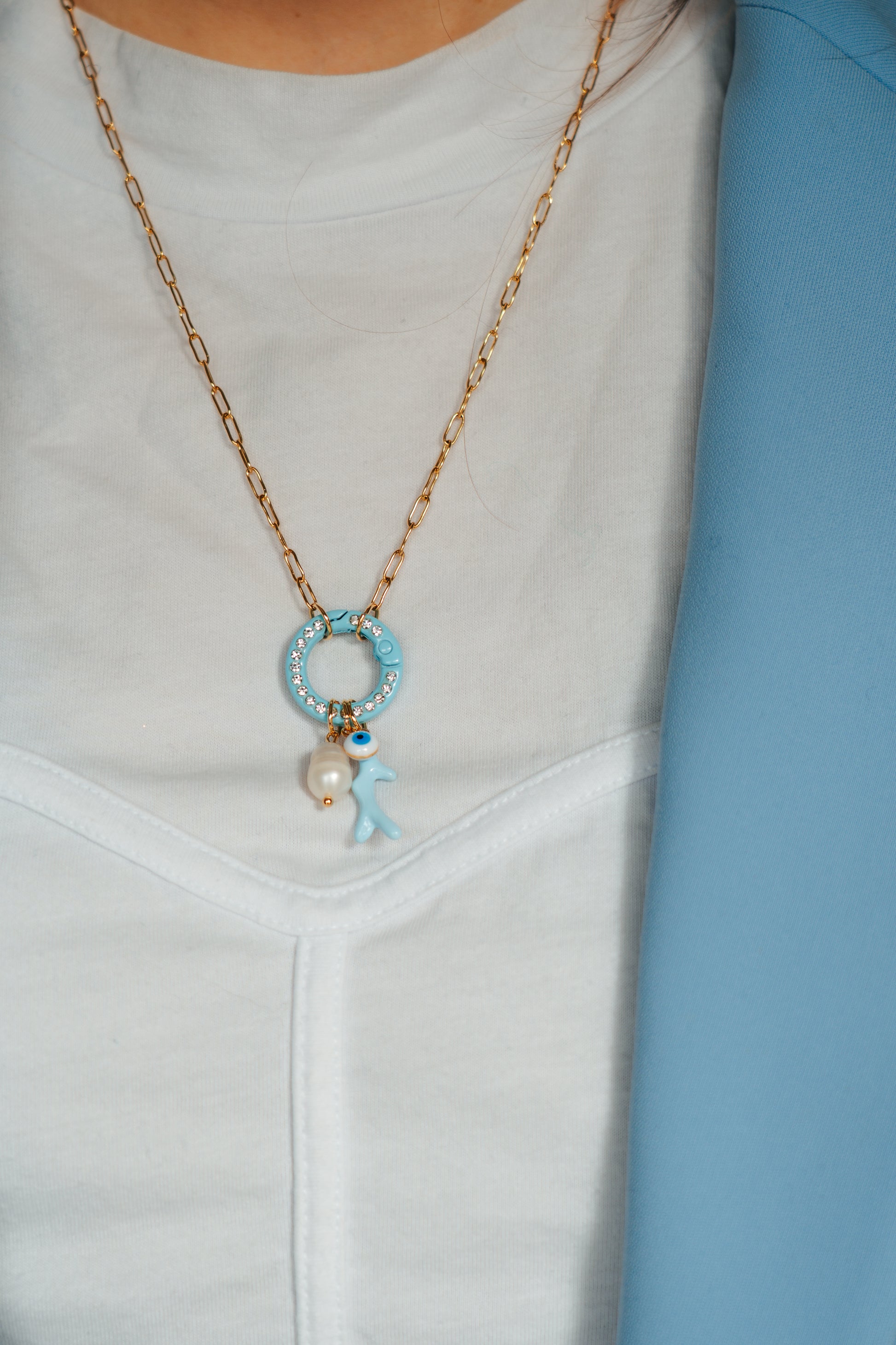 Composé d'une chaîne (taille du maillon au choix), un mousqueton bleu à strass et 3 cham's : oeil bleu, corail bleu et perle blanche🧿