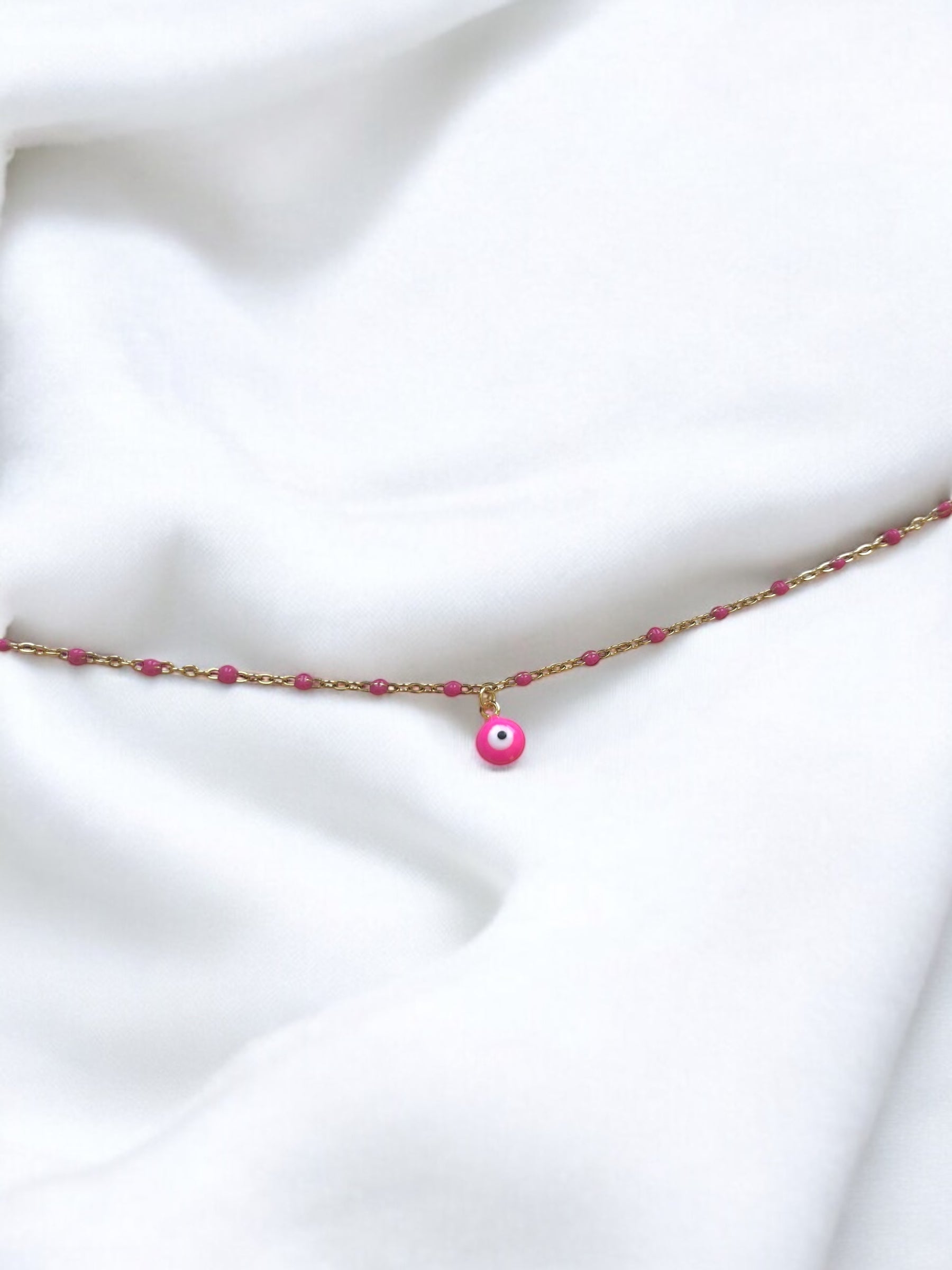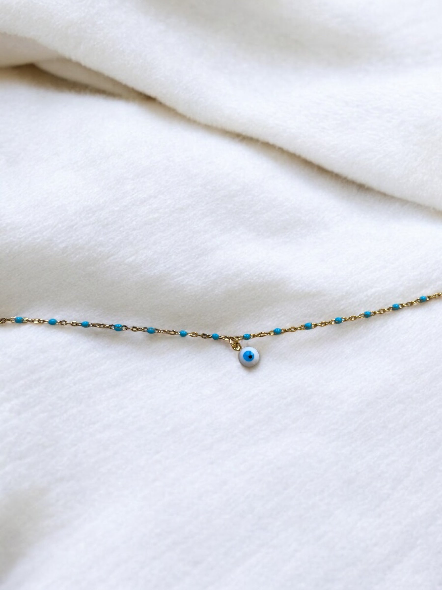 Composé d'une chaîne dorée et colorée et d’un pendentif œil.